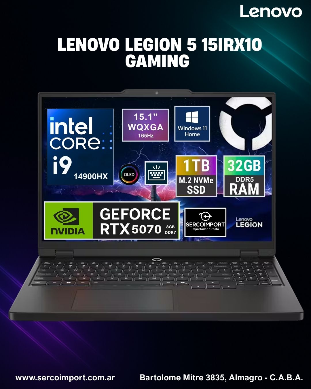 NOTEBOOK GAMING LENOVO LEGION 5 / MODELO 15IRX10 / PANTALLA 15.1 WQXGA ( 2560 x 1600 ) 165HZ OLED / PROCESADOR INTEL CORE I9 14900H 24 CORES 5.8Ghz / CAPACIDAD DISCO ESTADO SOLIDO TIPO M2 NVME 1TB ( 1000 GIGAS , AMPLIABLE CONSULTAR ) / MEMORIA RAM 32GB DDR5 5600Mhz ( AMPLIABLE CONSULTAR ) MÁXIMA VELOCIDAD Y FRECUENCIA / WINDOWS 11 HOME / PLACA GRAFICA DE VIDEO DEDICADA NVIDIA GEFORCE RTX 5070 8GB / ECLIPSE BLACK / TECLADO RETRO ILUMINADO