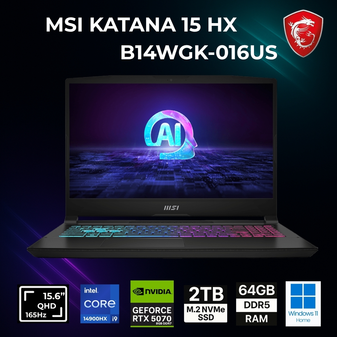 NOTEBOOK EXTREME GAMER MSI KATANA 15 HX B14WGK-016US / PANTALLA 15.6” QHD ( 2560 x 1440 ) 165HZ / PROCESADOR INTEL CORE I9 14900HX 24 CORES 5.8GHZ / CAPACIDAD DISCO ESTADO SÓLIDO NVME M2 2TB ( 2000 GIGAS ) / MEMORIA RAM 64GB DDR5 5600Mhz / PLACA GRÁFICA DE VIDEO DEDICADA NVIDIA GEFORCE RTX 5070 8GB / WINDOWS 11 HOME / BLACK / TECLADO ILUMINADO RGB / AI MSI ( INTELIGENCIA ARTIFICIAL )
